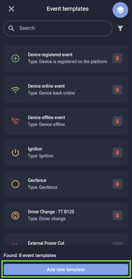 You will now see all the existing events that have been configured. Click the 'Add new template' button at the bottom of the page.