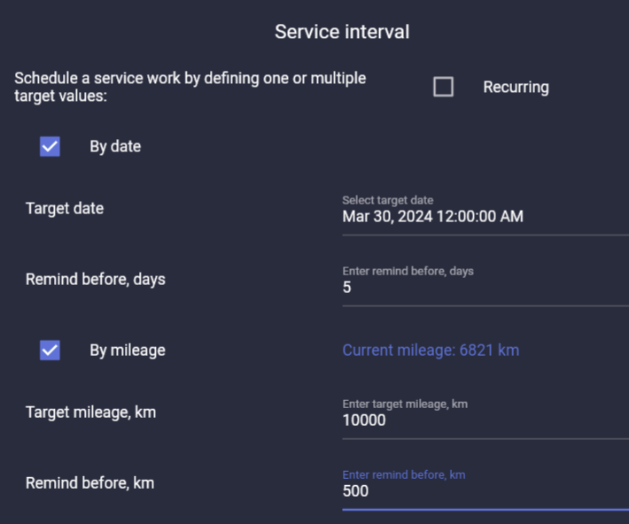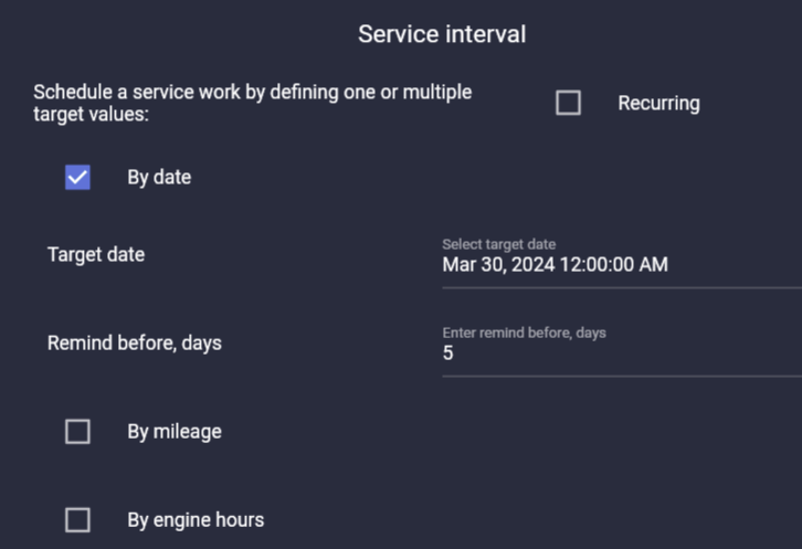 The service interval section allows you to select when the service work will be triggered (will change from Scheduled service work to Due service work). The three possible conditions to trigger a service work are: by date, by mileage, by engine hours. You can also select more than one condition.