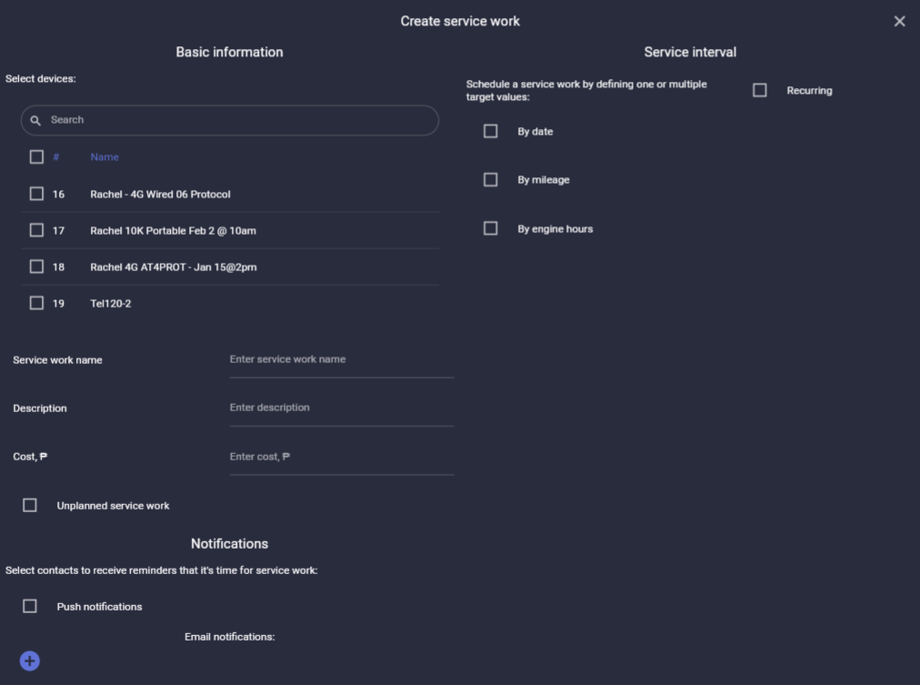If you click this box you will make this service work a recurring service work meaning when you complete the service work the system will automatically create a new service work with the same parameters (same devices, same intervals) as the original service work. This type of service work can come in handy for example when you want to perform an oil change every 5,000 km you would not need to create a new service work every 5,000 km. Instead, you would only need to click the recurring box, enter the first oil change interval and that's it!