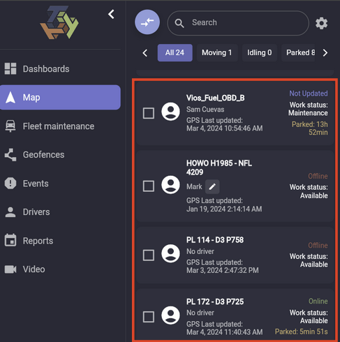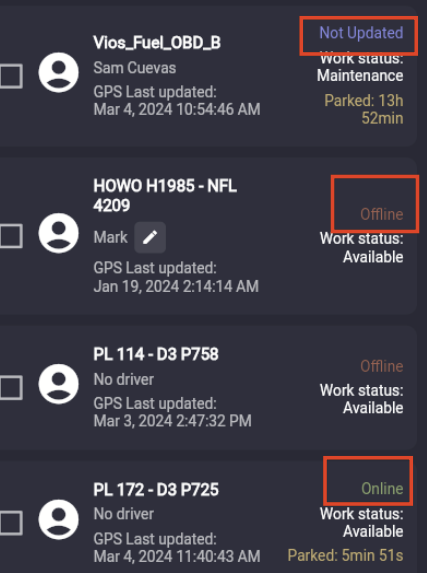 Work statuses - you can create different work statuses that you can assign to your devices so that you know which devices (vehicles) are available and which are not. You can also create your own work statuses.