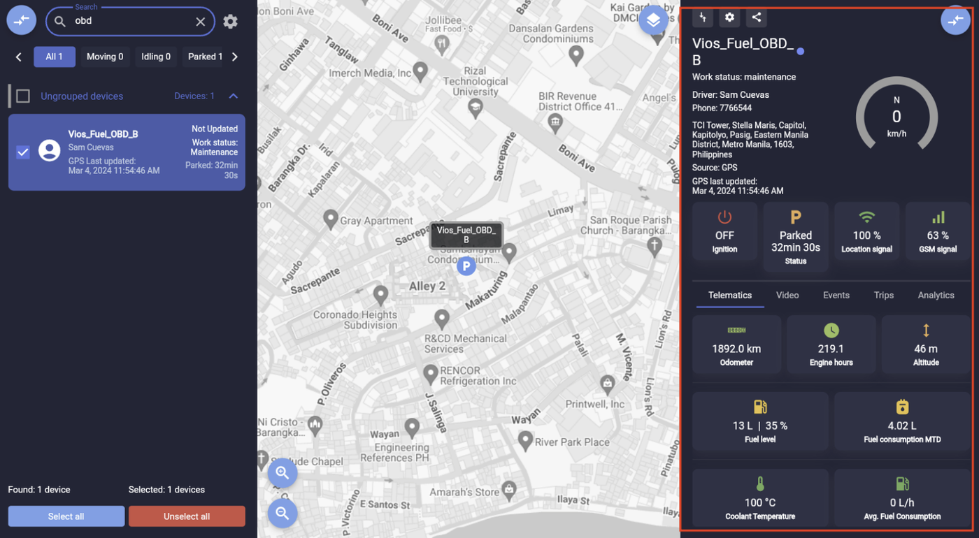 Analytics - displays key performance metrics of the device such as distance traveled, idling time, parked time, driving time, and more