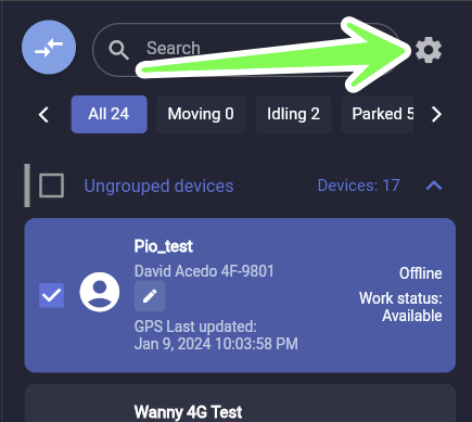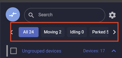At the top of the Device List you will see various device filters so that you can view only the devices that meet your filter criteria. For example, if you want to see in the Devices List only devices that are moving, click the 'Moving' button and you will get a list of all devices that are moving.