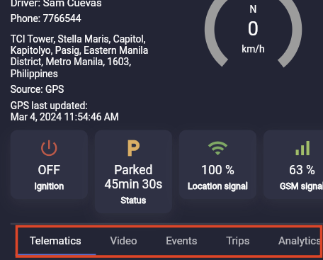 Events - displays any events and alerts that you have configured, such as over-speeding, entering/exiting geofences, ignition on/off and more