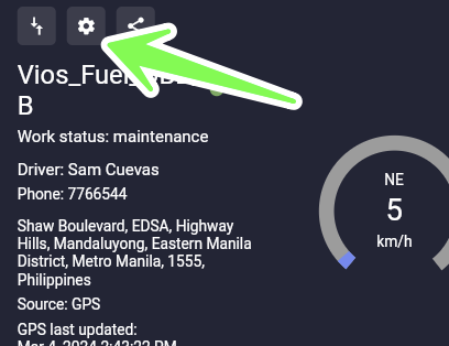 Device settings - You can change various details of the device including device name, work status, fuel type, engine hours, and odometer.