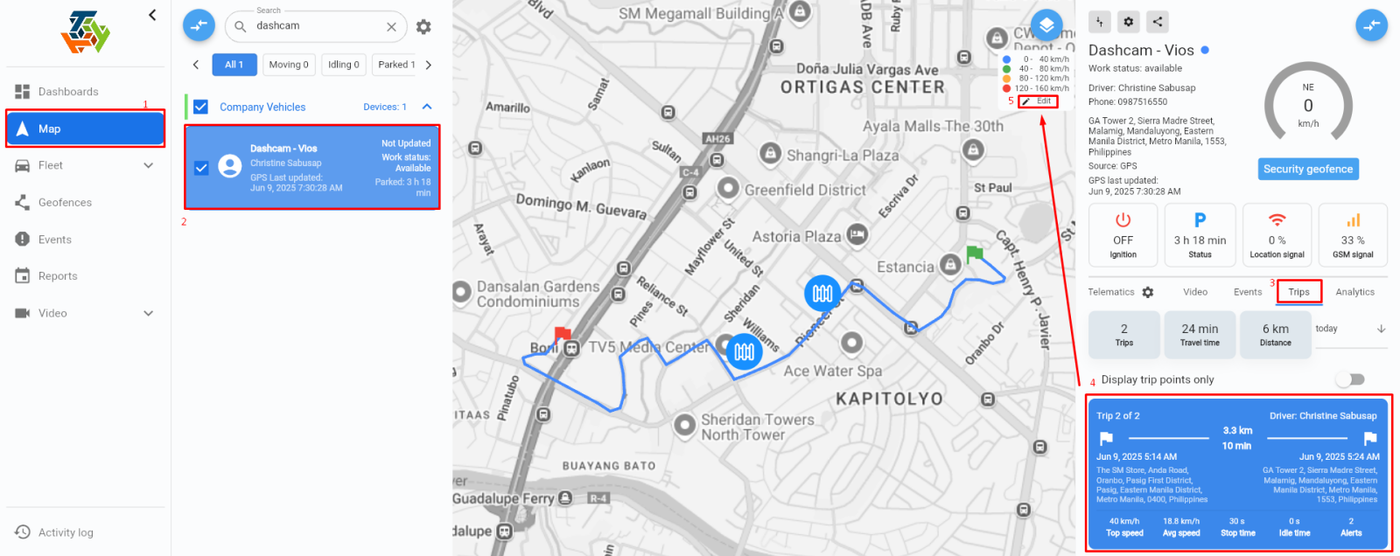 You can also edit the speed legend by selecting a trip from the Trips tab. This allows users to easily audit the displayed trip by visually reviewing the speed limits that you want to check.