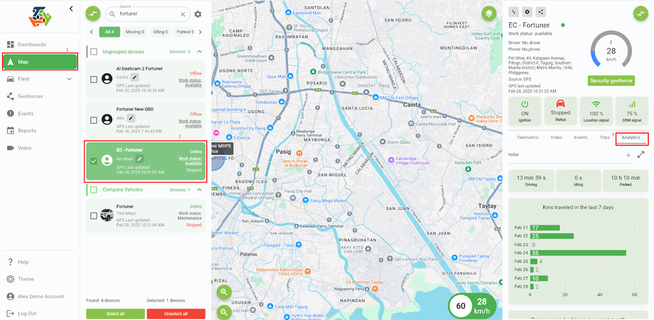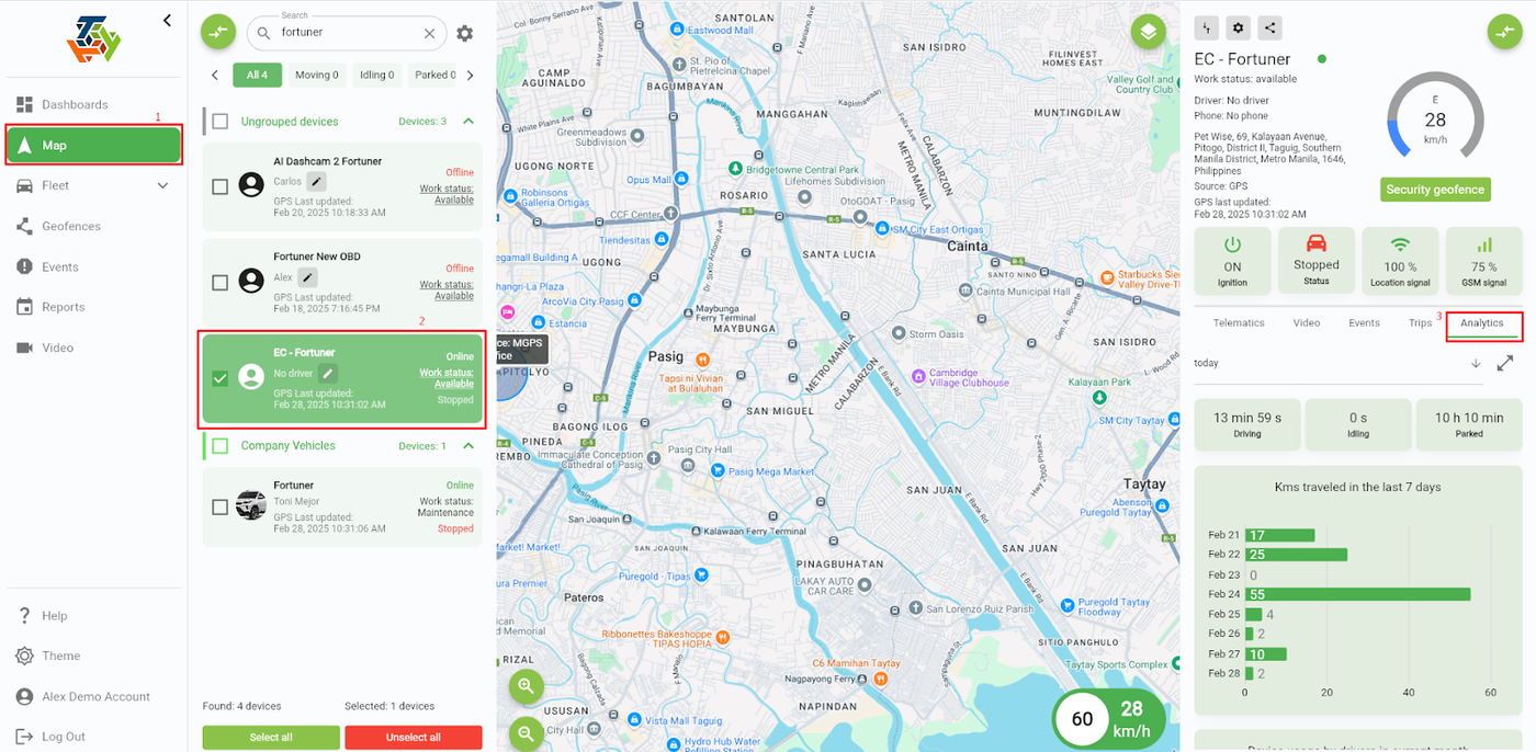 To navigate, go to the 'Maps page', select a device you want to check the analytics, and there will appear a new panel on the right side. Finally, click ‘Analytics tab’, and you can now see the key performance metrics for the selected device.