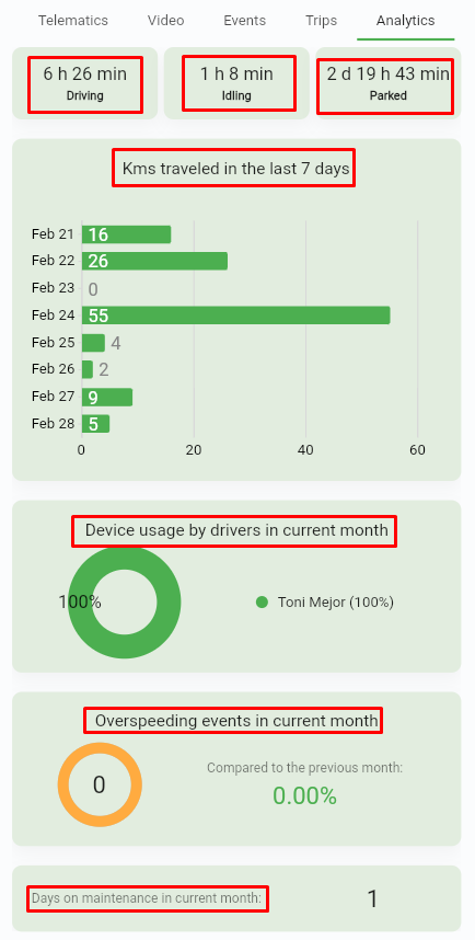 Kms traveled in the last 7 days - gives you an overview of the total distance covered by the vehicle in the past week, an easy way to track recent usage.