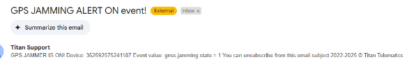 Jamming Detected - This state (red color) indicates that GPS jamming is actively occurring. When this happens, the device location will not update and GPS signal will drop significantly, potentially reaching 0%. Users can be alerted immediately via in-app notifications and email alerts (if enabled).
